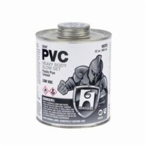 Hercules® PVC Cement, Heavy Slow Set, 32 oz, Dauber In Cap, 2.325 lb Net Weight, Liquid, Gray, Solvent, 481 g/L VOC, 14 to 23 deg F Flash, Composition: Furan, Tetrahydro, 2-Propanone, Cyclohexanone, Polyvinyl Chloride, Methyl Ethyl Ketone, Colloidal Silicon Dioxide, 0.88 to 0.92 Specific Gravity, 5 to 6 min Setting Time, 2 hr Curing, 40 to 110 deg F