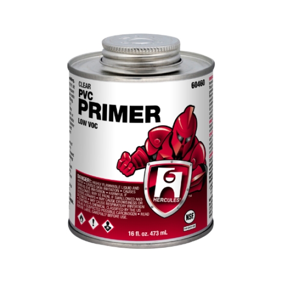 Hercules® Primer, Professional, 16 oz, Dauber In Cap, 1.116 lb Net Weight, For Use With: All Schedules and Classes of PVC Pipe and Fittings, Liquid, Clear, Solvent, 505 g/L VOC, 14 to 23 deg F Flash, Composition: Acetone, Cyclohexanone, Furan, Tetrahydro, Methyl Ethyl Ketone, 0.82 to 0.86 Specific Gravity