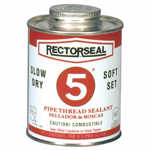 RectorSeal® No. 5® pipe thread sealant is a soft-set, slow drying compound which seals, lubricates, and protects threaded pipe and fittings. It can be pressurized immediately for piping up through 2" and 100 psi(for natural gas, air and water only) and is ideal for application with a wide variety of fluids and gases, including potable water applications. Recommended for use on threaded galvanized steel, iron, brass, copper, aluminum, stainless steel, polyethylene, fiberglass reinforced and PVC pipe. Not recommended for use with ABS,CPVC pipe or oxygen, chlorine and other oxidizers.