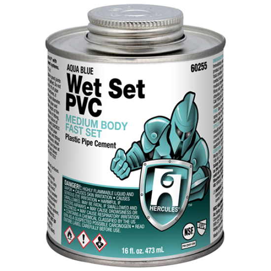 Hercules® Wet Set PVC Cement, Wet Set, 16 oz, Can, 15 lb Net Weight, For Use With: Potable Water, Pressure Pipe and Conduit, Translucent Liquid, Blue, Solvent, 443 g/l VOC, 14 to 23 deg F Flash, Composition: 40 to 70% Furan/Tetrahydro, 10 to 20% Polyvinyl Chloride, 5 to 15% Acetone, 5 to 15% Cyclohexanone, 5 to 15% Methyl Ethyl Ketone, 1 to 5% Silica/Amorphous/Fumed, 2 hr Curing, 40 to 110 deg F