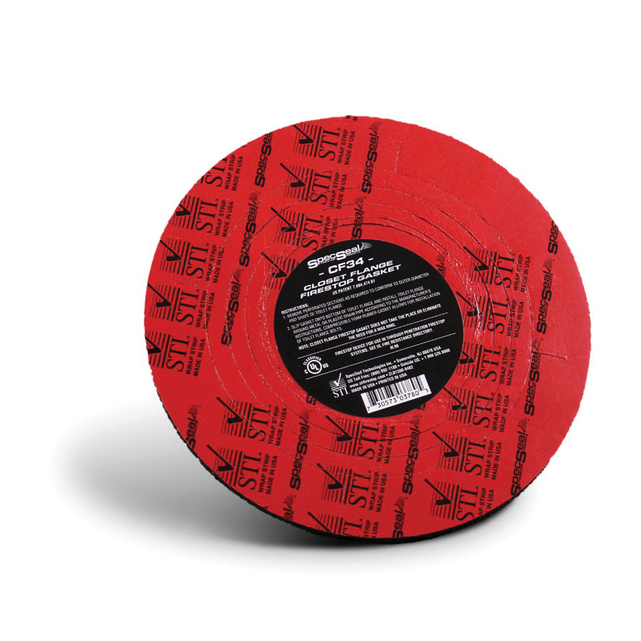 SpecSeal® closet flange firestop Gaskets are one-piece, molded rubber, intumescent pads that install beneath a 3 or 4 in (76 or 102 mm) closet flange to effectively firestop the opening. The die cut rubber gasket is perforated to delineate removable inserts sized to accommodate various outer diameters of toilet flanges. Traditional fire stopping methods require the firestop material to be applied around the pipe prior to setting the toilet flange, which can be problematic if the firestop material is not recessed a sufficient distance from the top to accommodate the throat of the flange. The alternative is to apply the fire stopping from the underside of the floor, necessitating the use of ladders or lifts. SpecSeal® closet flange firestop Gaskets solve the problem by providing a labor-friendly method of properly fire stopping the opening.