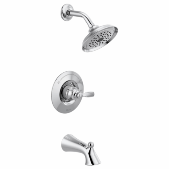 DELTA® Tub/Shower Trim, Woodhurst™, 1.75 gpm Shower Flow Rate, Pull-Up Spout, 6-1/2 in Spout Reach, 1 Handles, Lever Handle, 6-1/2 in Dia Trim, Pressure Balanced, Hand Shower: No, Spray Pattern: Full Body, Wall Mounting, For Use With: MuiltiChoice® Model R10000 Universal Rough Valve Body, Polished Chrome