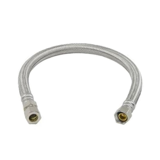 BrassCraft Speedi Plumb® PLUS 3/8 in. Compression inlet x 3/8 in. O.D. Compression outlet with Nut and Brass Sleeve flexible braided polymer water connector is corrosion resistant inside and out. Used to connect the water supply to a faucet with pigtail connections (copper tube), this connector features a high tenacity, multi-filament yarn, protected by a special polymer coating for optimum corrosion resistance and durability. On the inside, our tough PVC tubing resists attack by chlorine, chloramines and other corrosive elements. The braided polymer fibers are designed to bend freely without kinking or crimping.