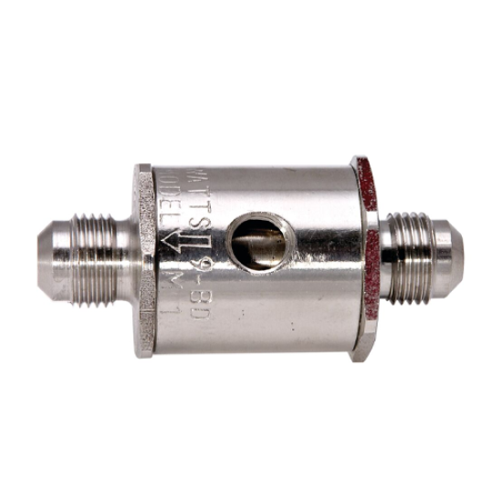 This 3/8 inch dual check vacuum breaker backflow preventer is designed for vending machine water supply lines to prevent the reverse flow of contaminates, such as carbon dioxide gas and carbonated water, from entering the potable water supply. It consists of a stainless steel body construction, rubber parts, dual check valves, ball check valve, and an atmospheric vent. It is designed for continuous pressure applications and complies with FDA food additive regulations. The maximum working pressure is 150 psi (10.3 bar).