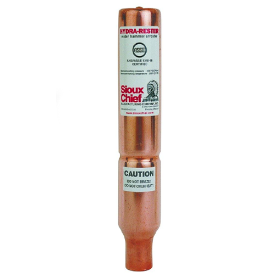 Sioux Chief 650 Series piston-type water hammer arresters shall be required in piping systems. Water hammer arresters shall have sufficient volume of air to dissipate the calculated kinetic energy generated in the piping system. Arresters shall be effective when installed at any angle. Arresters shall be approved for installation with no access panel required. Water hammer arresters shall be ANSI/ASSE 1010 2004 certified. Arresters shall be sized and placed per manufacturer’s instructions.