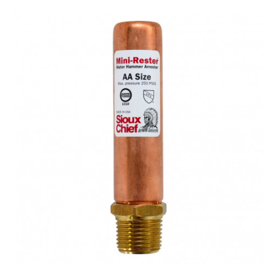 1/2" male threaded Mini-Rester water hammer arrestor by Sioux Chief. Connects to a 1/2" female threaded (FNPT/FIP) outlet. Generally installed upstream of the quick-shutting valves. Lead-free compliant and approved for potable water use.