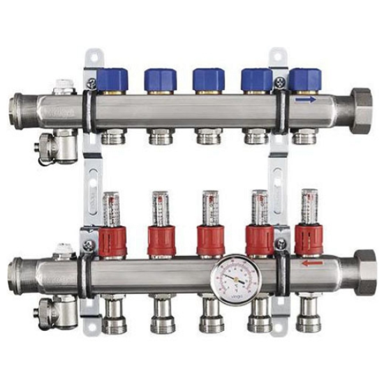 Stainless manifold is to be used in closed loop hydronic heating, cooling and snow melting systems. These preassembled 1-1/4" diameter stainless supply and return manifolds come attached to two 6-5/8" spacing brackets for compact remote mounting. This stainless manifold provides shut off and balancing valves with flow meters for each circuit. Each flow meter/balancing valve allows graduated flow setting up to 2 gpm, maximum 18 gpm per manifold. The air bleeder and purge valves are connected and factory tested. 1-1/4" Union connections, 1" NPT removable end caps. SVC Circuit connection fittings are sold separately.