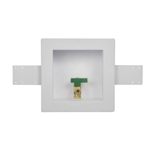 Oatey Ice Maker boxes can be used in commercial or residential applications which require supply valves recessed into the wall. Available water hammer arrestor option provides water pressure shock arrestors required for installation on supply lines to quick closing valves. Oatey Ice Maker Outlet Box, Square, For Use With: 1/4 Turn CPVC Low Lead Hammer Ball Valve, Polystyrene, 6 in W x 6 in H x 3-3/8 in D